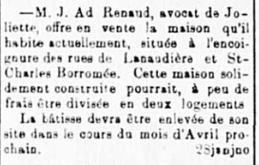 Lysandre St-Pierre dans un mémoire universitaire déposé en 2016 a documenté l’histoire de la maison construite pour J. Ad. Renaud en 1909 au coin des rues St-Charles-Borromée et de Lanaudière. Au début de l’année cet avocat ancien maire de Joliette a publié une annonce pour vendre sa maison qui devait être enlevée en avril pour en construire une nouvelle au même emplacement.