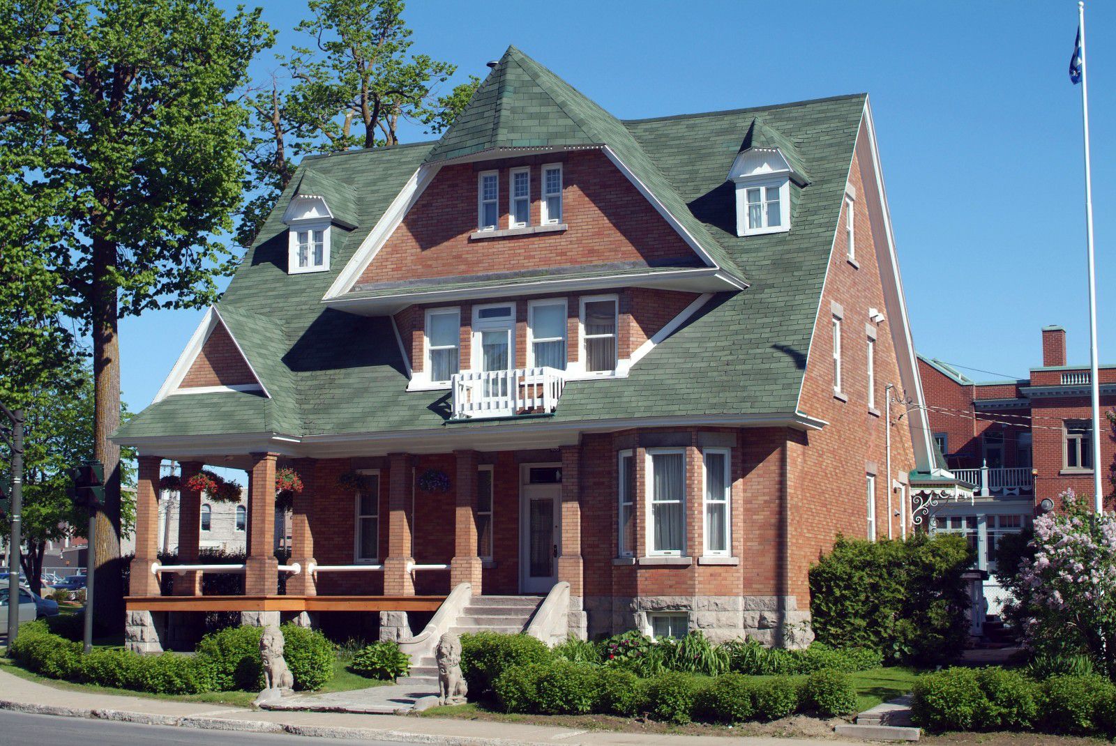 Le style Néo-Queen Anne se retrouve dans plusieurs éléments de cette résidence. Au premier coup d’œil, on remarque instantanément les colonnes imposantes sur socles et le pignon en saillie qui avance sur le tiers de la propriété. La lucarne et la grande galerie enveloppante caractérisent à la fois ce style britannique et la touche d’Alphonse Durand qui en use très souvent. À l’origine, l’architecte a fait un choix très intéressant en intégrant des fenêtres de forme sphérique dans la partie inférieure aplatie. Malheureusement, nous ne pouvons plus admirer ce détail architectural car elles ont été remplacées par des fenêtres en anse de panier. Celles-ci respectent tout de même le style de l’ensemble de la maison et représentent une bonne solution de rechange.