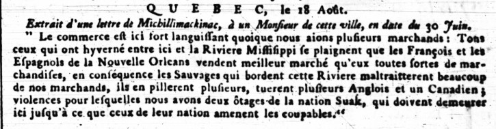La traite des fourrures était un métier risqué qui dépendait des relations entretenues avec les nations indiennes et de la politique des gouvernements. La guerre de Pontiac contre l’armée anglaise avait certainement perturbé la traite des fourrures et il valait mieux être en bons termes avec lui. Pondiac a fait soulever plusieurs nations de sauvages, qui doivent s’assembler ici au premier du mois prochain, pour faire tous les efforts qu’ils pourront contre les Anglois… six Anglois, un François, un Sauvage Huron et un Delaware, sont arrivés depuis peu à l’Illinois du Fort Pitt, qu’ils ont été arrêtés par ordre de Pondiac, et qu’ils ont été amenés prisonniers à Owellanon, où ils ont été brûlés, à l’exception de deux que Pondiac amene avec lui pour les donner aux Manes.