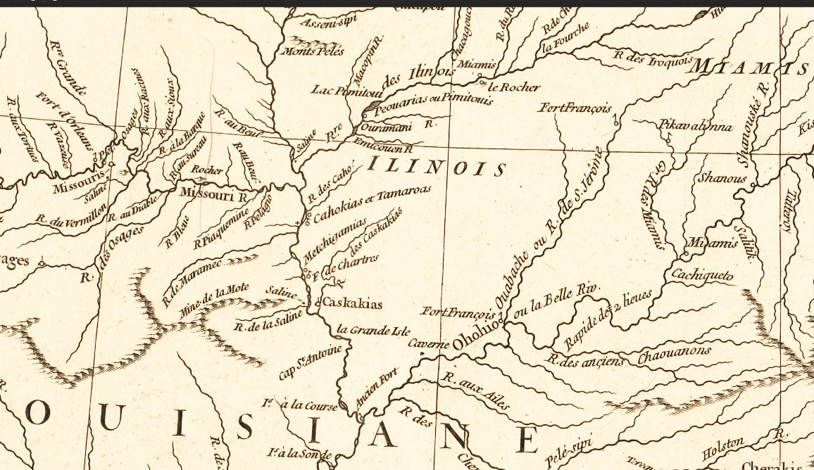 Cette carte du pays des Illinois à l’époque de son arrivée montre les villages de Cahokia et Tamaroas, le fort de Chartes et Caskakias sur le Mississipi. On y voit beaucoup de noms français, la rivière de la Saline, la mine de la Mote, la Grande Isle, le cap St-Antoine, etc. Les affluents du fleuve, la rivière des Illinois, le Missouri, l’Ohio ou Ouabache ou Belle rivière permettaient de parcourir le centre du continent pour la traite des fourrures.