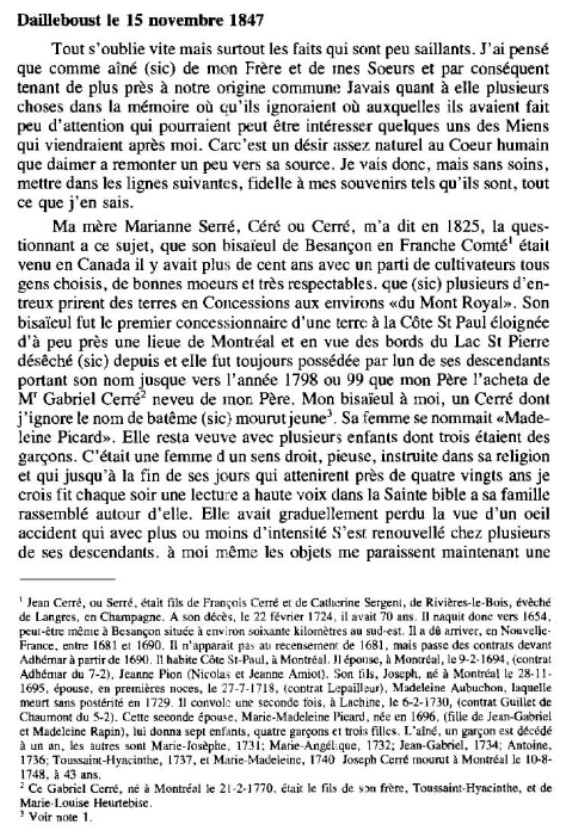 Ma mère Marianne Serré, Céré ou Cerré m’a dit en 1825 (elle est décédée à Ste-Mélanie en 1828) que son bisaïeul de Besançon en Franche-Comté était venu en Canada il y avait plus de cent ans avec un parti de cultivateurs, que plusieurs d’entre eux prirent des terres en concessions aux environs du Mont-Royal. Son bisaïeul avait pris une terre à la Côte St-Paul à une lieue de Montréal en vue des bords du lac St-Pierre desséché depuis. Cette terre était restée dans la famille Cerré et vers 1798 ou 99 Pierre-Louis Panet père d’Amélie l’avait rachetée de son neveu Gabriel Cerré. Son bisaïeul dont elle ignorait le prénom avait épousé Madeleine Picard.