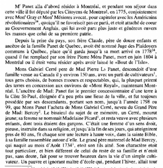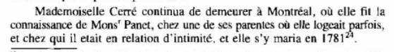 Il a poursuivi ce récit à partir du mariage de mademoiselle Marie Anne Cerré avec Pierre-Louis Panet en 1781. Mademoiselle Cerré continua de demeurer à Montréal où elle fit la connaissance de Monsieur Panet chez une de ses parentes où elle logeait parfois et chez qui il était en relation d’intimité, et elle s’y maria en 1781. Elle n’avait que 16 ans.