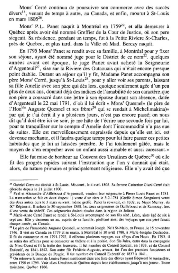 Monsieur Cerré continua de poursuivre son commerce avec des succès divers, venant de temps à autre au Canada et enfin mourut à St-Louis, Missouri, en mars 1805... Durant un séjour qu’il fit à Montréal, madame Panet accompagna son père, monsieur Cerré, jusqu’à St-Louis, pour y aller voir ses parents, laissant sa fille Amélie avec son père qui dès lors, quoique seulement âgée d’un peu plus de deux ans, donnait déjà des indices de l’amabilité de son caractère…