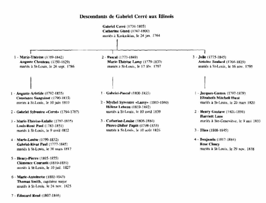 Marthe Faribault-Beauregard a ajouté quelques documents d’archives à sa publication. D’abord un arbre généalogique des autres enfants de Gabriel Cerré et Catherine Giard demeurés aux Illinois. Les parents s’étaient mariés à Kaskaskia, leurs 3 enfants se sont mariés à St-Louis.