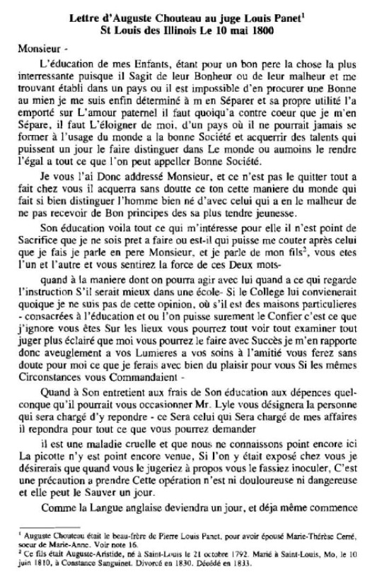 Les riches commerçants de St-Louis envoyaient leurs enfants étudier à Montréal, Pascal frère de Marie Anne était venu en 1785. En 1800 Auguste Chouteau dans une lettre à son beau-frère le juge Pierre-Louis Panet lui confie lui aussi l’éducation de son fils car il ne pouvait pas l’assurer à St-Louis. Il lui demande d’en prendre soin à Montréal en l’assurant de sa pleine confiance.