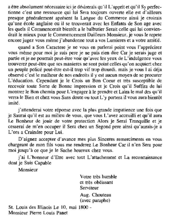 Il demande à P.-L. Panet de faire inoculer son fils contre la picotte, maladie inconnue aux Illinois. Il voudrait aussi que son fils soit éduqué dans une école anglaise pour apprendre la langue du commerce. Ses manières ne sont pas celles que l’on acquiert chez un peuple policé, peut-être est-il trop vif trop étourdi mais je l’ai déjà observé c’est le malheur de nos endroits, il y est aucun moyen de se procurer l’éducation.