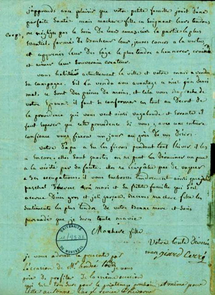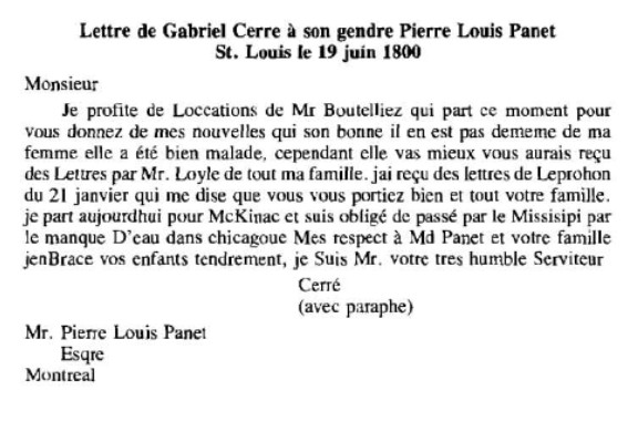 Gabriel Cerré et son gendre Pierre-Louis Panet, époux de Marie Anne, entretenaient une correspondance. Le 24 juin 1785 Gabriel Cerré a écrit à monsieur Panet à Québec. Il lui fait part de son chagrin d’avoir appris le décès des 2 premiers enfants du couple, Pierre-Louis (3 juillet 1782 – 9 août 1783) et Pierre-Gabriel (8 septembre 1783 – 28 février 1784). Il le remercie ensuite de prendre soin de son fils Paschal qu’il avait envoyé à Montréal pour son éducation dans la famille de sa soeur aînée: soyez à son égard frère et père.