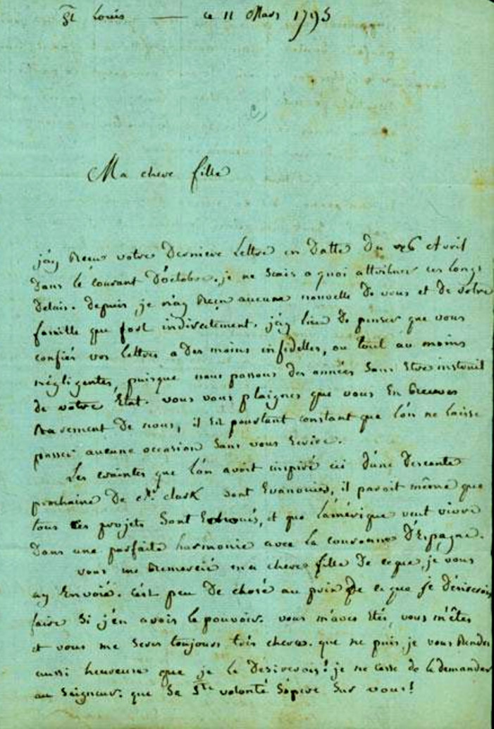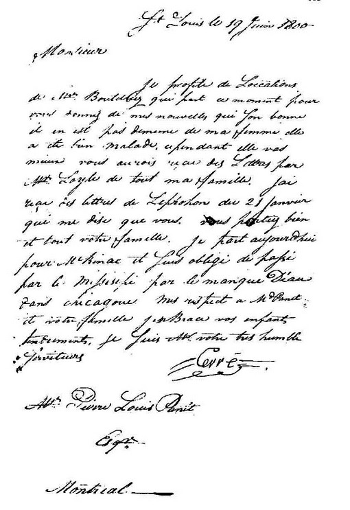 Communique ce que je te dis en ce moment soit à ton mari, soit à ma soeur Chouteau ou à son mari ou à notre frère Paschal selon que la prudence et l’amitié et la confiance que nous nous devons tous te le suggèrera, garde en toi même ce que je te dis si tu as quelques raisons de croire que cela pourrait occasionner la plus petite altercation entre nous…