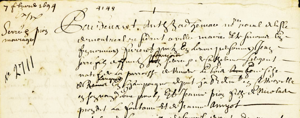 Marthe Faribault-Beauregard a ajouté des notes à ces mémoires, l’ancêtre se nommait Jean Cerré né vers 1654 et il est arrivé en Nouvelle-France entre 1681 et 1690. Il a épousé le 9 février 1694 Jeanne Pion. Le greffe du notaire Antoine Adhémar dit Saint-Martin a été numérisé, leur contrat de mariage a été signé le 7 février.