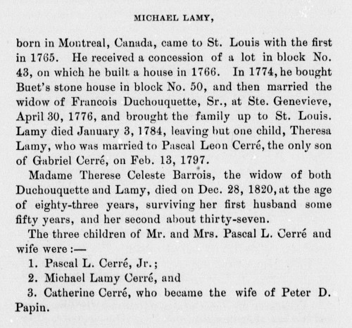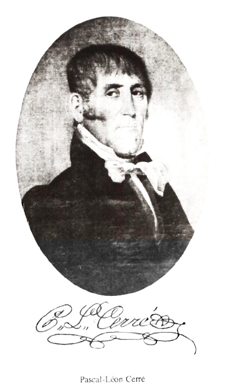Né en 1773 Pascal Cerré avait épousé en 1797 Marie-Thérèse Lamy qui venait d’une famille de marchands. Il a été actif dans le commerce des fourrures jusqu’en 1849. Michel Lamy le père de Thérèse était venu de Montréal à St-Louis en 1765. Le couple a eu 3 enfants, Pascal Léon junior, Michel Lamy et Catherine.