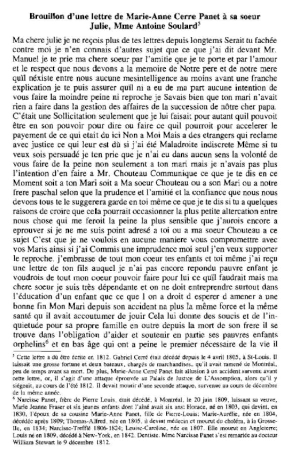 Dans le brouillon d’une lettre de Marie-Anne à sa soeur Julie épouse de Antoine Soulard datant de 1812, on trouve quelques informations sur la succession de Gabriel Cerré décédé le 4 avril 1805. Marie Anne s’était brouillée avec sa famille à cette occasion. Dans la note de bas de page on lit que Gabriel Cerré avait laissé une grosse fortune et 2 bateaux chargés de marchandises ramenées de Montréal peu avant sa mort.