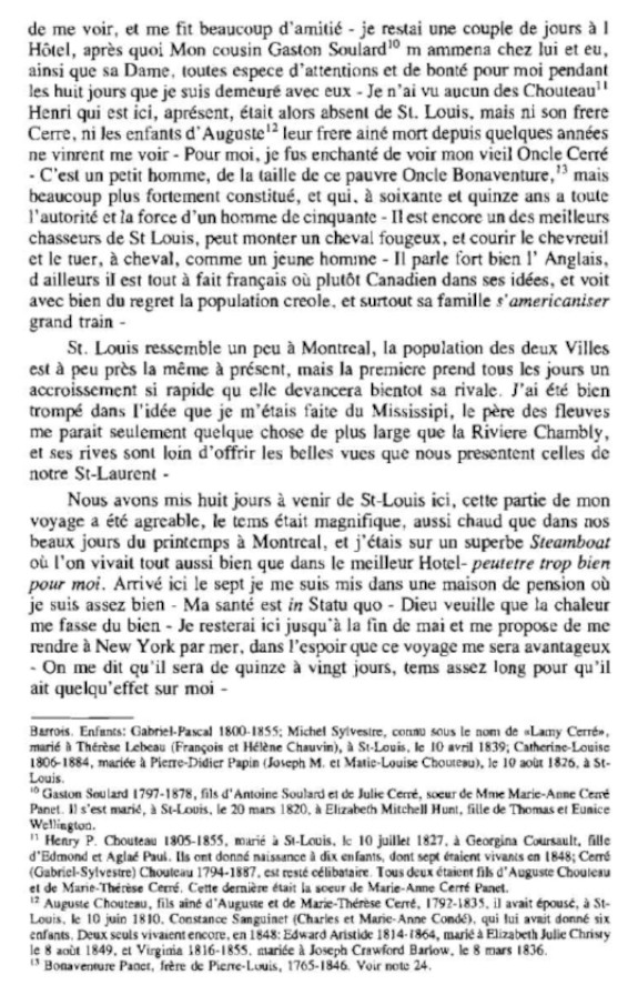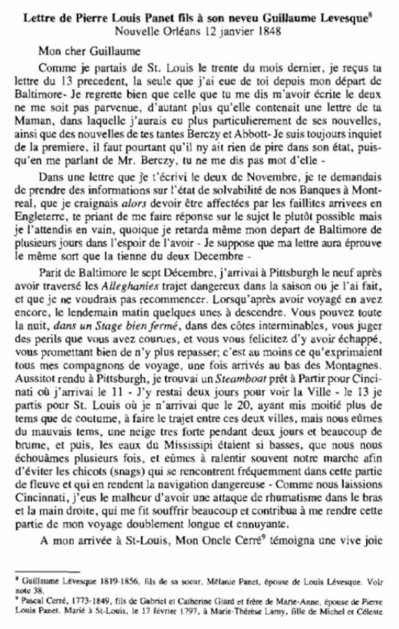 Les liens familiaux entre la famille Panet et leurs cousins de St-Louis se sont prolongés dans le temps. En 1847 Pierre-Louis fils du juge Panet et de Marie-Anne Cerré a fait un voyage à St-Louis qu’il raconte dans une lettre à son neveu Guillaume Lévesque. Parti de Baltimore le 7 décembre 1847 il avait traversé les Alleghanies jusqu’à Pittsburgh puis il avait pris un steamboat jusqu’à Cincinati et il était arrivé à St-Louis le 20.