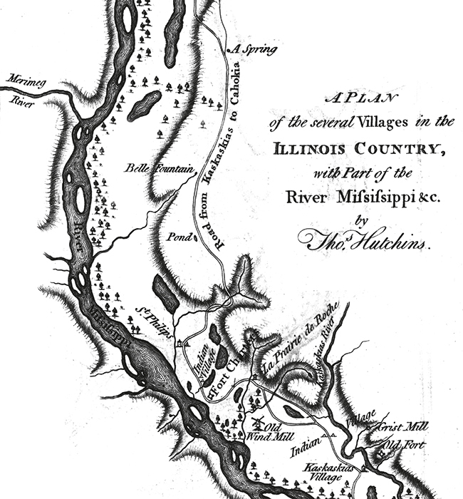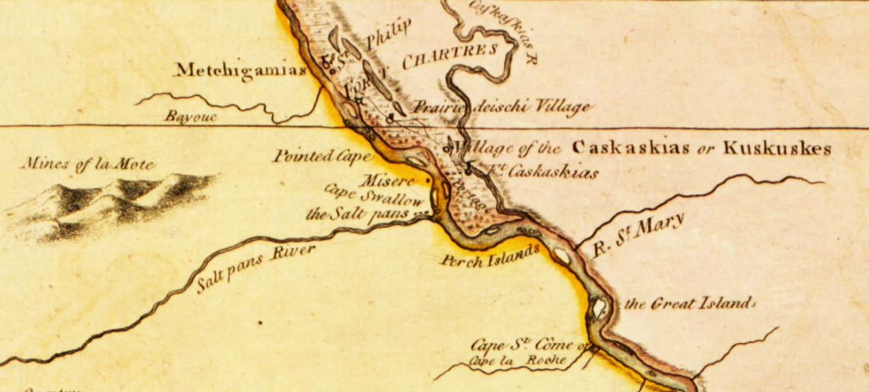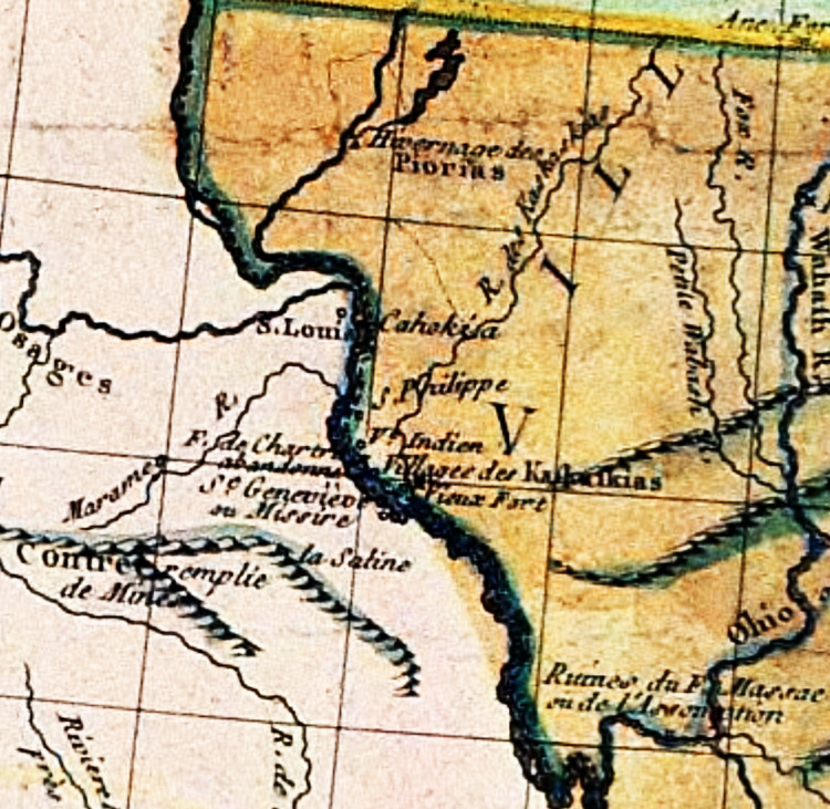 La carte suivante montre les villages de Cahokia au nord, St-Philippe à mi-chemin, Ste-Geneviève et Kaskaskia au sud. Le fort de Chartres abritait la garnison française protégeant le territoire. On remarque un moulin à vent et un moulin à farine sur la rivière Kaskaskia. De l’autre côté du Mississipi il y avait des salines sur la rivière de la Saline qui produisaient du sel pour les industries. Les fermiers expédiaient des tonnes de blé par le fleuve pour nourrir le sud de la Louisiane et la Nouvelle-Orléans ainsi que des légumes et du porc. Il y avait un village indien au nord de Kaskaskia et un autre près du fort de Chartres.