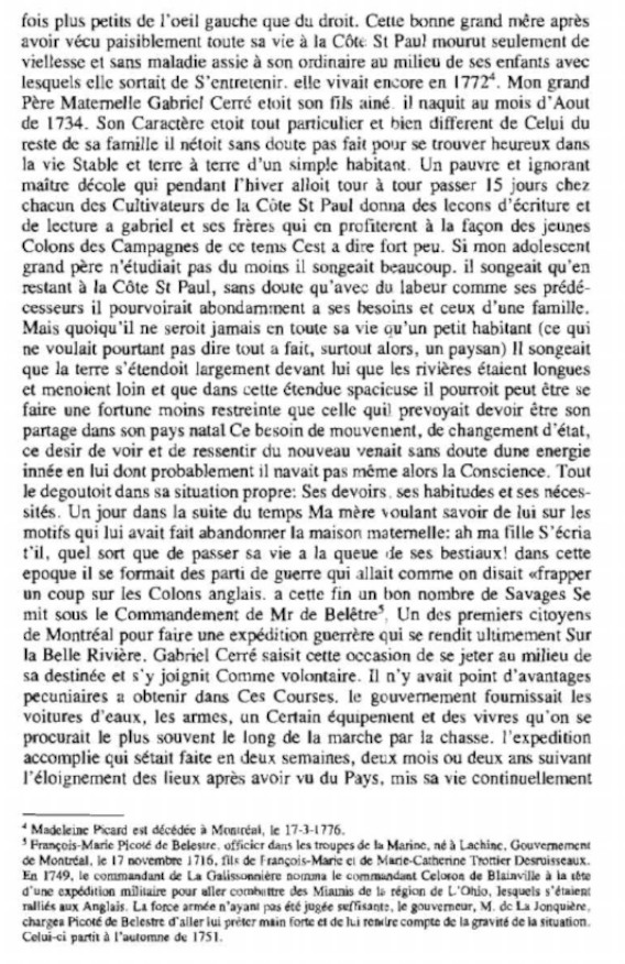 Mon grand-père maternel Gabriel Cerré était son fils aîné, né en août 1734. Son caractère était tout particulier et bien différent de celui du reste de sa famille, il n’était sans doute pas fait pour se trouver heureux dans la vie stable et terre à terre d’un simple habitant… Il songeait que la terre s’étendait largement devant lui, que les rivières étaient longues et menaient loin et que dans cette étendue spacieuse il pourrait peut-être se faire une fortune…