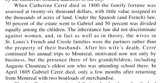 Quand leur mère Catherine Cerré est décédée en 1800 la fortune de la famille était estimée à 26.000 dollars et des milliers d’acres de terre. Selon la loi espagnole (et française) la moitié est revenue à son mari Gabriel et l’autre moitié aux 4 enfants. Gabriel a continué ses voyages annuels à Montréal jusqu’à sa mort en 1805.