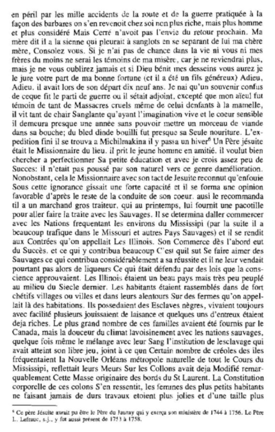 Les Illinois étaient un beau pays mais très peu peuplé au milieu du siècle dernier. Les habitants étaient rassemblés dans de fort chétifs villages ou villes et dans leurs alentours sur des fermes qu’on appelait là des habitations. Ils possédaient des esclaves nègres, vivaient toujours avec facilité, plusieurs jouissaient de l’aisance et quelques d’entre eux étaient déjà riches. Le plus grand nombre de ces familles avait été fourni par le Canada, mais la douceur du climat, l’avoisinement avec les nations sauvages, quelque fois même le mélange avec leur sang, l’institution de l’esclavage qui avait atteint son libre jeu, joint à ce qu’un certain nombre de créoles des îles fréquentaient la Nouvelle-Orléans métropole naturelle de tout le cours du Mississipi, reflétant leurs moeurs sur les colons, avait déjà modifié remarquablement cette masse originaire du bord du Saint-Laurent.