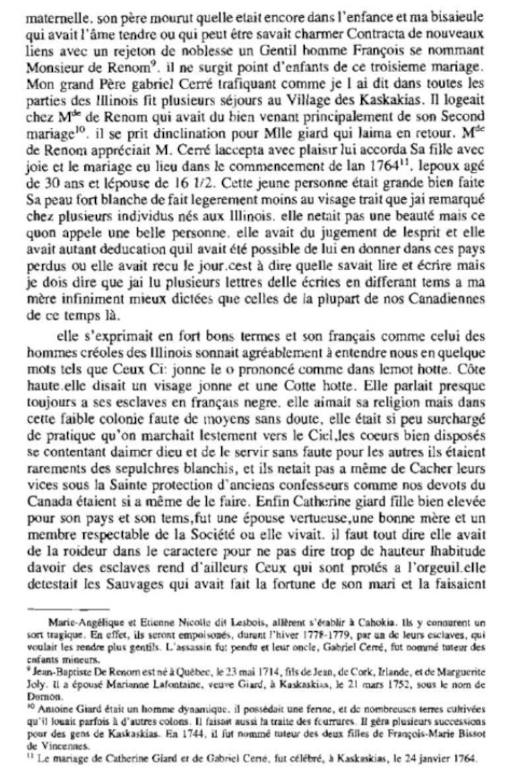 Mon grand-père Gabriel Cerré trafiquant dans toutes les parties des Illinois fit plusieurs séjours au village des Kaskaskias. Il logeait chez madame de Renom qui avait du bien venant principalement de son second mariage. Il se prit d’inclination pour Melle Giard qui l’aima en retour. Mme de Renom appréciait M. Cerré et l’accepta avec plaisir, elle lui accorda sa fille avec joie et le mariage eut lieu en 1764, l’époux âgé de 30 ans et l’épouse de 16 et demi. Elle était grande, bien faite. Sa peau était fort blanche, légèrement moins au visage, trait que j’ai remarqué chez plusieurs individus nés aux Illinois; elle n’était pas une beauté mais ce qu’on appelle une belle personne. Elle avait du jugement, de l’esprit et elle avait autant d’éducation qu’il avait été possible de lui en donner dans ces pays perdus où elle avait reçu le jour; c’est-à-dire qu’elle savait lire et écrire mais je dois dire que j’ai lu plusieurs lettres d’elle écrites en différents temps à ma mère infiniment mieux dictées que celles de la plupart de nos canadiennes de ce temps là.