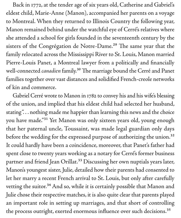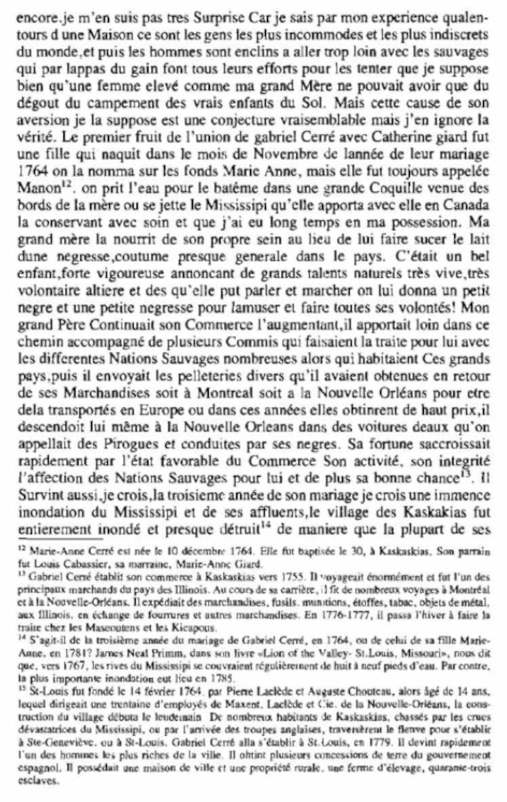 Le premier fruit de l’union de Gabriel Cerré avec Catherine Giard fut une fille qui naquit dans le mois de novembre de l’année de leur mariage 1764, on la nomma Marie Anne mais elle fut toujours appelée Manon. On prit l’eau pour le baptême dans une grande coquille venue des bords de la mer où se jette le Mississipi qu’elle apporta avec elle en Canada. Ma grand-mère la nourrit de son propre sein au lieu de lui faire sucer le lait d’une négresse, coutume presque générale dans le pays. Dès qu’elle put parler on lui donna un petit nègre et une petite négresse pour l’amuser et faire toutes ses volontés.