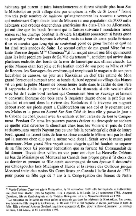 Le second enfant de ma grand-mère fut ma tante Thérèse depuis Mme Chouteau, il lui naquit ensuite une fille qui mourrut dans les huit premiers jours de sa vie du tetanos. La petite Manon était fort jolie et fut l’enfant chéri de son père, sa mère et Mme de Renom… Mon grand-père voyait avec chagrin qu’il lui faudrait se séparer de sa fille pour lui procurer l’éducation que sa fortune lui commandait de lui donner. Il avait deux villes en vue pour cet objet, la Nouvelle Orléans au bas du Mississipi ou Montréal au Canada son propre pays. Il fit choix de ce dernier et prenant sa fille aînée accompagné de son épouse il descendit par Chicagou les lacs Michigan et Huron et la rivière des Outaouais jusqu’à Montréal, traite d’au moins six cents lieues, à la fin d’août 1772 pour placer sa fille de 7 ans pensionnaire au couvent des Soeurs de la Congrégation pour l’espace de 2 ou 3 ans.