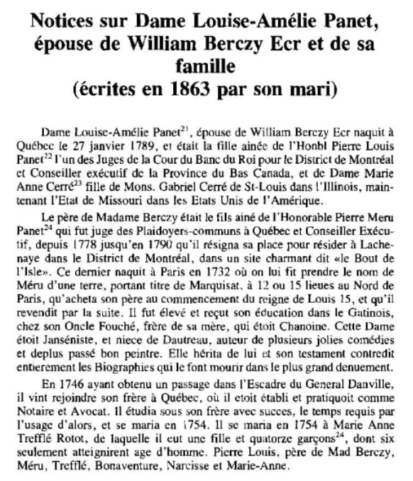 Notices sur Dame Louise-Amélie Panet, épouse de William Berczy Ecr et de sa famille (écrites en 1863 par son mari)