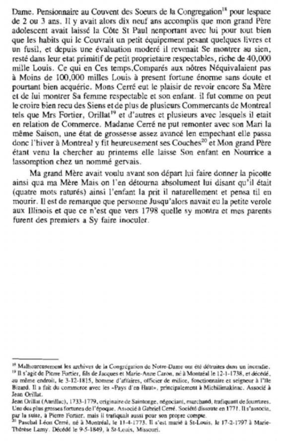 Il y avait alors dix neuf ans accomplis que mon grand-père adolescent avait laissé la Côte St-Paul n’emportant avec lui pour tout bien que les habits qui le couvraient, un petit équipement pesant quelques livres et un fusil, et depuis une évaluation modérée il revenait se montrer aux siens restés dans leur état primitif de petits propriétaires respectables riche de 40.000 louis, fortune énorme et pourtant bien acquérie. Mons. Cerré eut le plaisir de revoir encore sa mère et de lui montrer sa femme respectable et son enfant. Il fut comme on peut le croire bien reçu des siens et de plus de plusieurs commerçants de Montréal tels que Mrs. Fortier, Orillat et d’autres avec lesquels il était en relation de commerce. Madame Cerré ne put remonter avec son mari la même saison, un état de grossesse assez avancé l’en empêchant, elle passa donc l’hiver à Montréal, y fit heureusement ses couches et mon grand-père étant venu la chercher au printemps elle laisse son enfant en nourrice à L’Assomption chez un nommé Gervais.