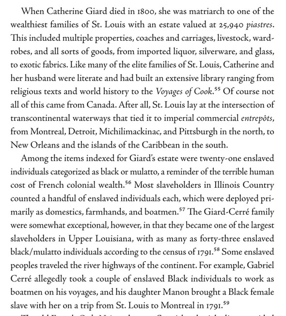 Catherine Giard est décédée en 1800 en étant la matriarche des familles les plus riches de St-Louis. La famille Cerré-Giard possédait 43 esclaves noirs et mulâtres en 1791. Gabriel Cerré en employait certains pour la traite des fourrures comme canotiers et sa fille Marie Anne en avait ramené une avec elle à Montréal en 1791.
