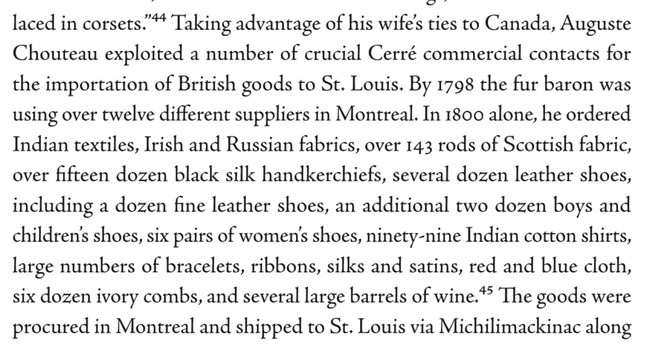 Profitant des contacts de Cerré à Montréal, ce baron de la fourrure ayant 12 pourvoyeurs différents en 1798, Chouteau pouvait importer des marchandises précieuses à St-Louis en passant par Michilimakinac le long des routes de la traite des fourrures.