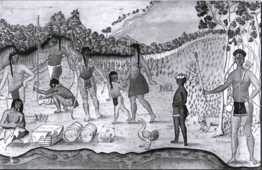 Ce groupe d’Amérindiens représentant des «sauvages de plusieurs nations» a été peint en Louisiane, en 1735, par l’architecte Alexandre de Batz. Au premier plan, on note des peaux de chevreuil et de la graisse d’ours que ces derniers comptent échanger contre des marchandises de troc. Parmi ce groupe, on relève la présence d’un jeune esclave noir qui, selon la légende de ce dessin, appartient au guerrier Atakapas, situé à droite de cette œuvre.