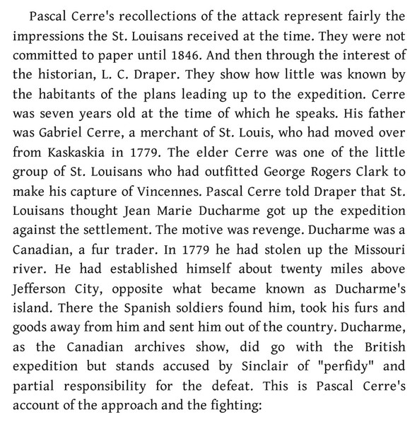 Dans un autre récit de l’attaque on lit que parmi les 7 esclaves capturés par les indiens lors de l’attaque, 5 appartenaient à Gabriel Cerré. Les américains menés par George Rogers Clark avaient occupé Kaskaskia et Cahokia; les anglais les ont attaqué sans succès.