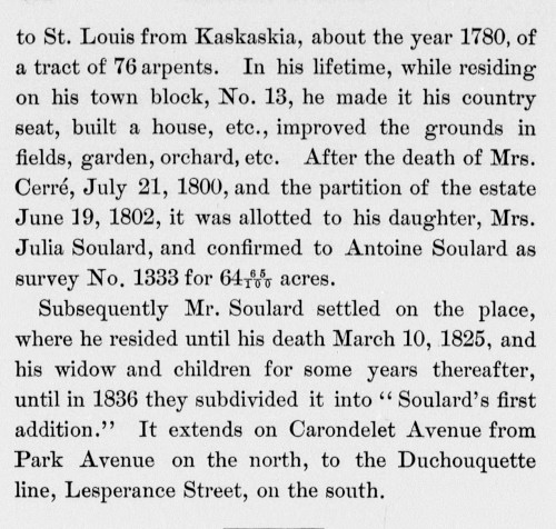 Antoine Soulard avait fui la terreur pendant la révolution française et était arrivé aux Illinois en 1794. Il avait été employé par le gouvernement espagnol à la construction d’un fort à Ste-Geneviève puis il s’était installé à St-Louis où il a été employé comme arpenteur par le gouvernement. Julie née en 1775 a épousé Antoine Soulard en 1795.