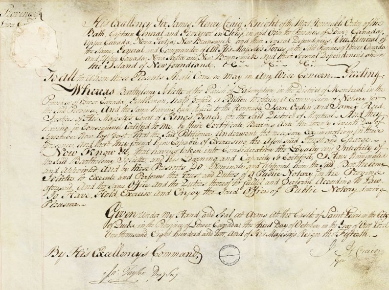 Les documents de la collection sont très divers, plusieurs concernent la famille de Lanaudière et Barthélémy Joliette. Par exemple l’original de la commission de notaire public de B. Joliette par le gouverneur Craig du 3 octobre 1810.