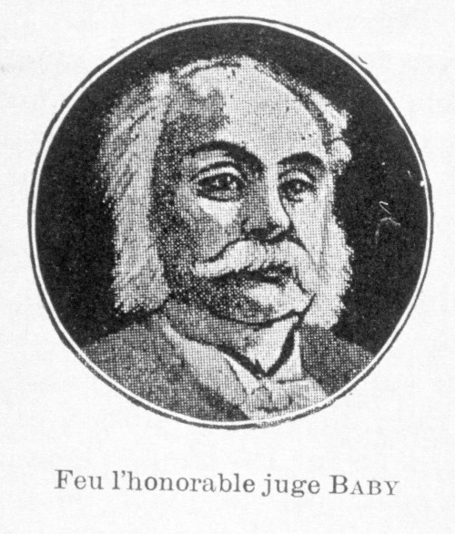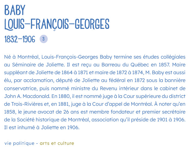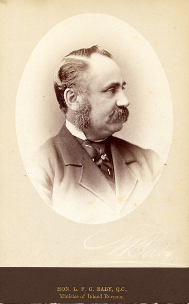 Dans le livre de J.-A. Charlebois Les Anciens du Séminaire on trouve une courte biographie de Louis-François-Georges Baby né à Montréal en 1832. Admis au Barreau en 1857 il s’était établi à Joliette. Élu député fédéral conservateur en 1872 il a ensuite été ministre sous John A. MacDonald puis nommé juge.