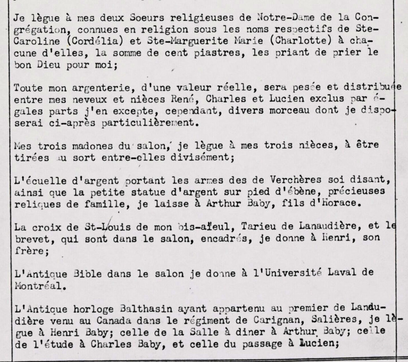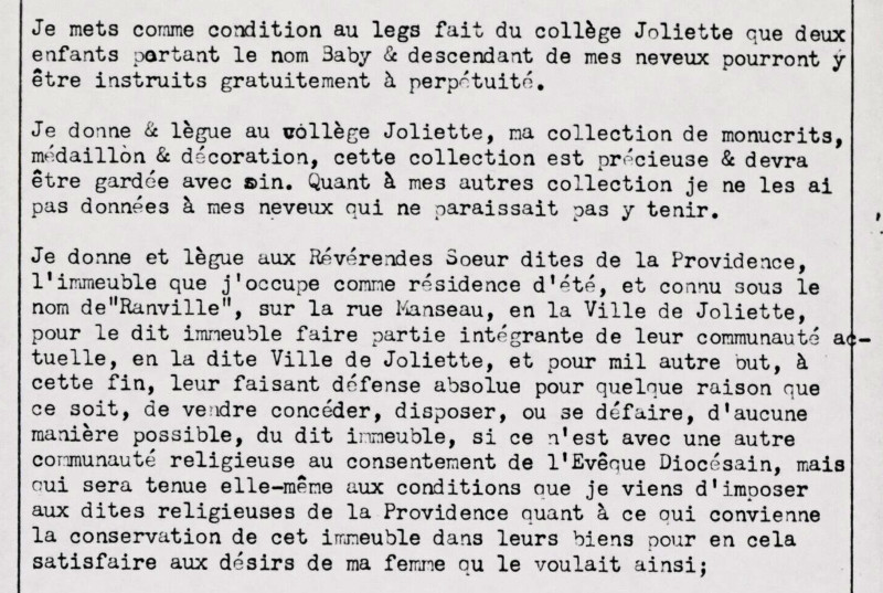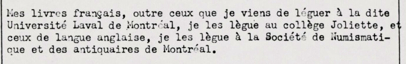 Mes livres français, outre ceux que je viens de léguer à la dite Université Laval de Montréal, je les lègue au collège Joliette, et ceux de langue anglaise, je les lègue à la Société de Numismatique et des antiquaires de Montréal.