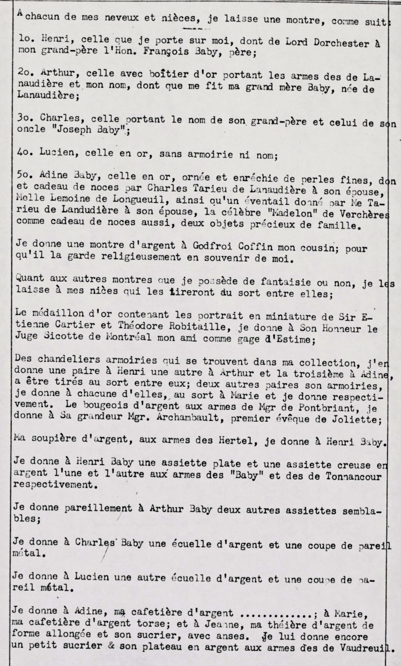 Le juge Baby avait rassemblé une importante collection d’argenterie, orfèvrerie et autres trésors qu’il a partagée entre les membres de sa famille et des amis. Son argenterie devait être pesée et distribuée; il y avait 3 madones, la croix de St-Louis de son ancêtre Tarieu de Lanaudière, une Bible pour l’Université Laval, des horloges, des montres, etc.