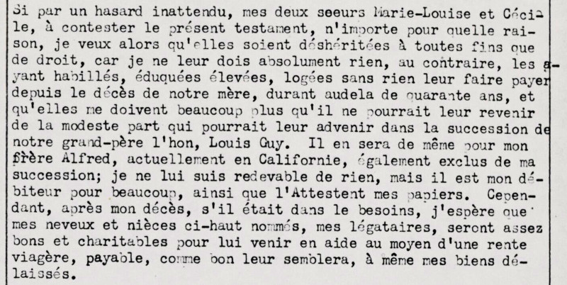 Le juge Baby a pris ses précautions pour que les membres de sa famille ne contestent pas son testament. Il affirme ne rien devoir à ses soeurs Marie-Louise et Cécile qu’il a habillées, éduquées, logées pendant 40 ans. Son frère Alfred demeurant en Californie est explicitement exclus de la succession.