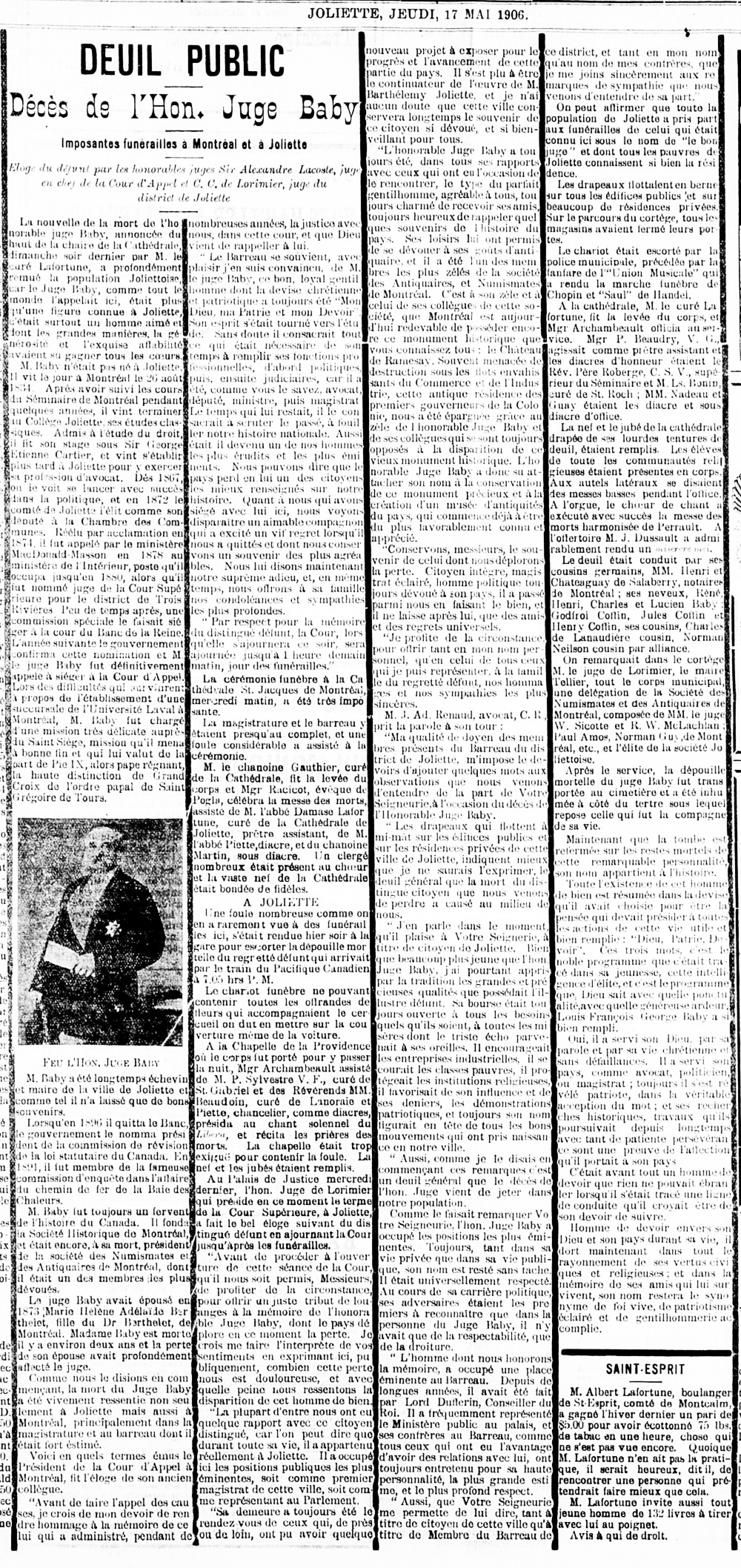 L’honorable juge Louis-François-Georges Baby mourut à Montréal le 13 mai 1906, à l’âge de 74 ans. Une cérémonie funèbre eut lieu à la Basilique de Montréal, le 15, sous la présidence de Mgr Racicot, évêque de Pogla. La magistrature et le barreau y furent presqu’au complet et une foule considérable assista à ce premier service. Le 17, jour des funérailles et de l’inhumation à Joliette, Mgr Archamheault officia en présence des autorités et de toute la population.