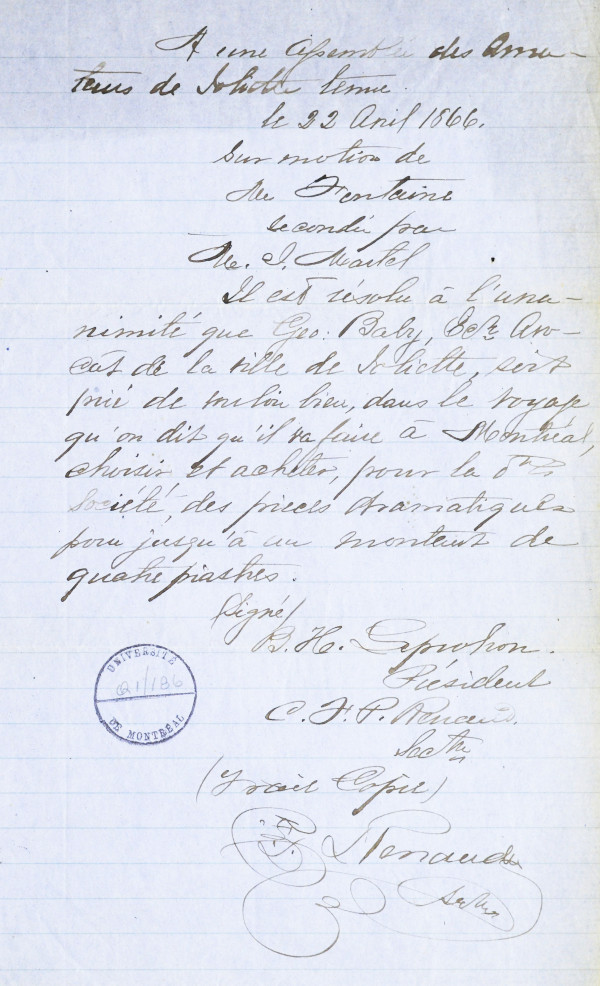 Une procuration des Amateurs de Joliette à Georges Baby pour l’achat de pièces dramatiques du 22 avril 1866 est un exemple de la diversité des documents.