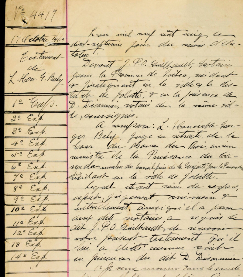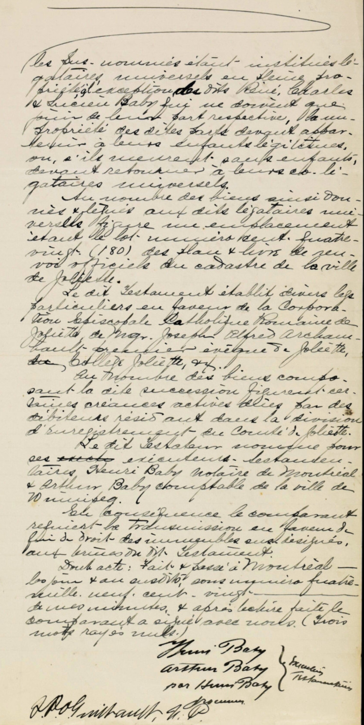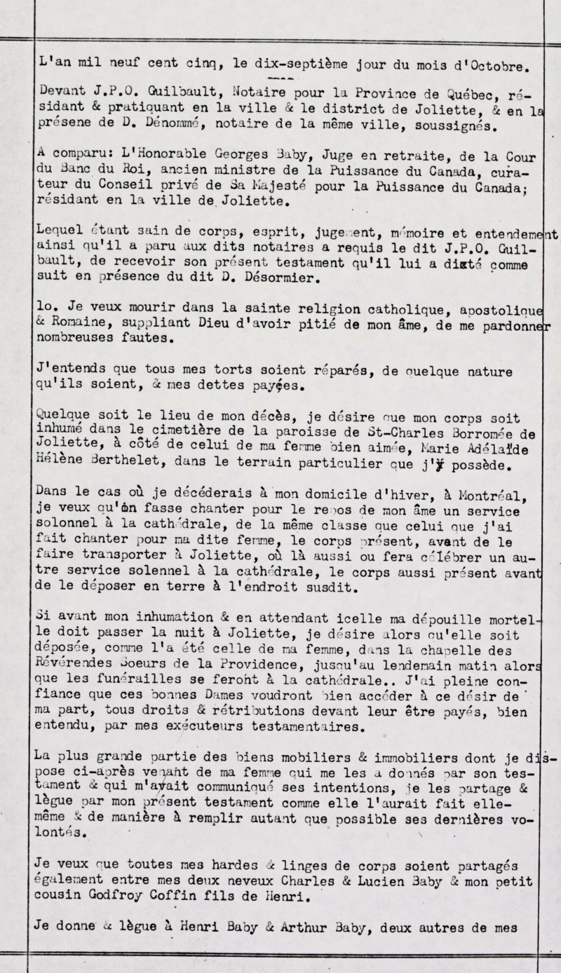 Le testament de l’Honorable Georges Baby juge en retraite de la Cour du Banc du Roi, ancien ministre de la Puissance du Canada, curateur du Conseil privé de sa Majesté, a été rédigé en présence de deux notaires, J.P.O. Guilbault et D. Désormier le 17 octobre 1905 à Joliette. Il est décédé peu après le 13 mai 1906.