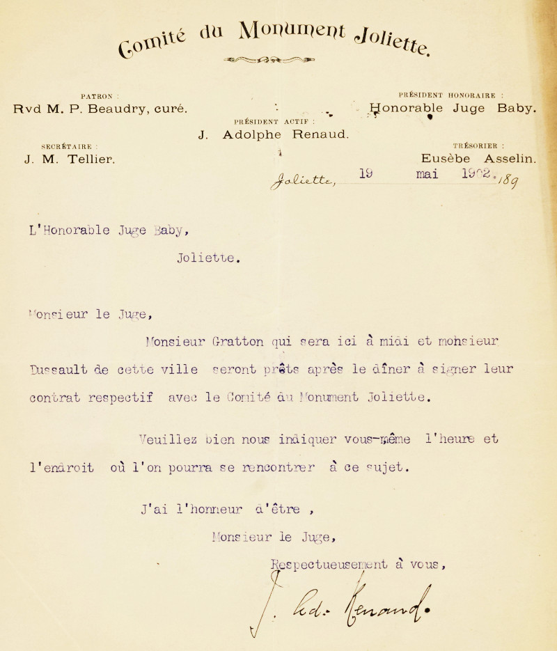 L’Honorable Juge Baby avait été nommé président honoraire du Comité du Monument Joliette érigé au parc Renaud en 1902. Il a conservé tout un dossier concernant l’attibution des contrats aux sculpteurs et les discours prononcés lors de l’inauguration.