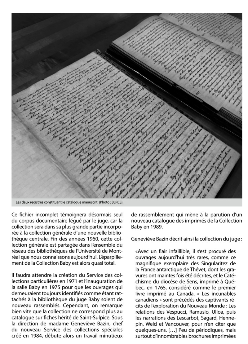 Un article de Eric Bouchard dans la revue Cap-aux-Diamants raconte l’histoire de l’éparpillement de la collection: Le catalogue manuscrit de la bibliothèque du juge Baby témoin de l’oeuvre d’une vie.