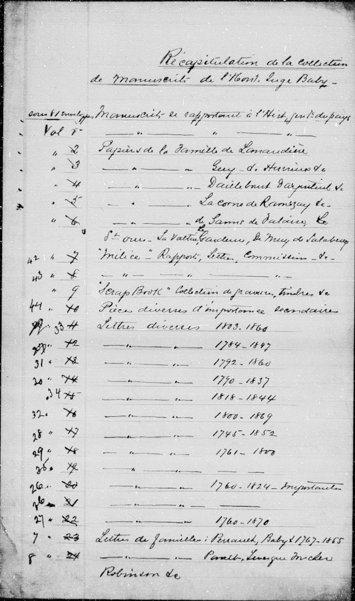 Copies de pièces diverses, 1586-1835; inventaire de la collection de manuscrits du juge Baby signé par Peter Michael O’Leary; copies de papiers de la famille Lanaudière, 1672-1890; copie de papiers de la famille Guy, 1675-1858; copies de jugements de la Prévôté et de l’Amirauté de Québec, 1717-1719; transcriptions de lettres des auteurs suivants: monsieur le juge Baby, monsieur D’Ailleboust de Cuisy, madame Laronde-Bonnaventure, monsieur Cerry; lettre manuscrite de monsieur Mousseau, 3 mai 1860, dans laquelle il demande des informations pour sa recherche sur Joseph Duquet, exécuté pour des raisons politiques en 1838; billet du 2 novembre 1864; lettre manuscrite de madame Marbeau demandant au juge Baby de réfuter un article intitulé « Catholiques canadiens inférieurs à leurs compatriotes protestants », Paris, 10 novembre 1890, et réfutation.