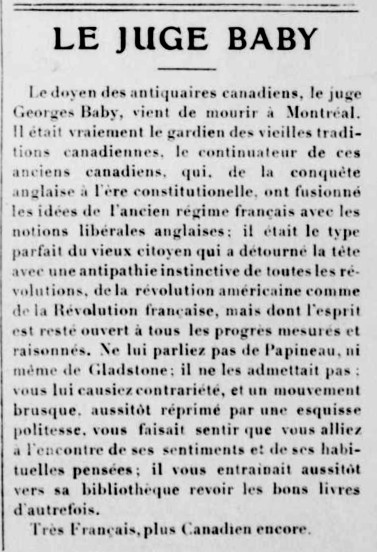 Le doyen des antiquaires canadiens, le juge Georges Baby vient de mourir à Montréal. Il était vraiment le gardien des vieilles traditions canadiennes… Très Français, plus Canadien encore.
