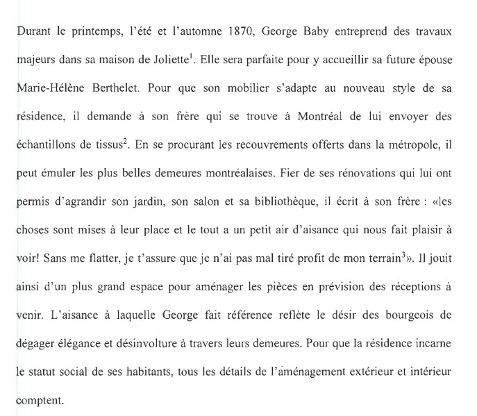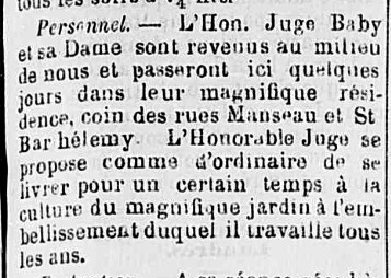 Vers cette date G. Baby et son épouse ont quitté Joliette pour n’y venir que pendant l’été dans leur résidence du boulevard Manseau. Il avait été nommé juge. L’Hon. M. Baby a loué une résidence à Ottawa, où sa famille se rendra vers le mois d’octobre. (La Gazette de Joliette, 5 septembre 1879)