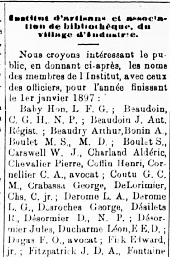 Il est nommé en premier dans la liste des membres de l’Institut d’artisans et association de bibliothèque du village d’Industrie en 1896, c’était alors le principal notable de la ville de Joliette.