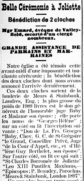 Le juge Baby et son épouse Hélène Guy Berthelet ont donné à la paroisse une cloche de 1.989 livres nommée Georges Hélène en 1897. Le clocher de l’église St-Charles-Borromée s’est effondré en 1901, il ne pouvait peut-être pas soutenir une telle charge.