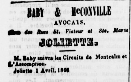 En 1879 les avocats Baby, McConville & McConville étaient les procureurs de la Compagnie du Chemin de Fer à rails du St-Laurent et du village d’Industrie qui demandait un amendement à son acte d’incorporation pour construire un embranchement vers St-Gabriel de Brandon.