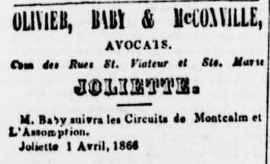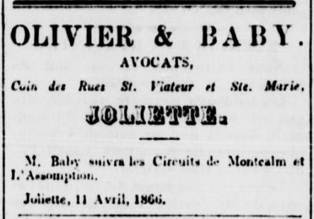 Georges Baby jeune avocat a d’abord pratiqué à Montréal mais des ennuis de santé l’ont amené à s’associer à Louis-Auguste Olivier en 1860 dans le cabinet Olivier & Baby situé au coin des rues St-Viateur et Ste-Marie; la rue Ste-Marie était le prolongement de la place Bourget vers le palais de justice de Joliette. Lors d’un incendie général en 1881 le bâtiment a été détruit.