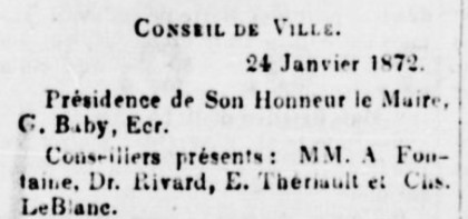 En février 1874 G. Baby ne s’est pas représenté à l’élection comme maire de Joliette. L’avocat Georges Baby était aussi un homme d’affaires qui a fait de nombreuses transactions à Joliette et ses alentours. En 1871 il était co-propriétaire d’un moulin à farine d’avoine et de blé et d’un moulin à scies sur la rivière de l’Assomption en amont de Joliette.