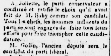 Georges Baby a aussi été élu député de Joliette en 1872. Mercredi soir les amis de M. G. Baby, avocat, Maire de la ville de Joliette, Membre de la Chambre des Communes le conviaient à un grand dîner dans les salles de l’Institut… M. Baby parla près d’une demi heure et son discours si approprié à la circonstance fut chaleureusement appiaudi… (La Gazette de Joliette, 25 novembre 1872)