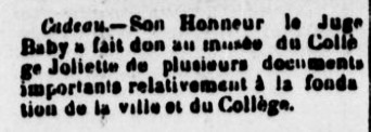 Son Honneur le Juge Baby a fait don au musée du Collège Joliette de plusieurs documents importants relativement à la fondation de la ville et du Collège.